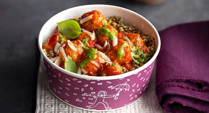 Polpette di legumi al pomodoro + riso, pesto e ricotta salata