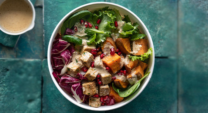 Tofu allo zenzero, patate dolci, melograno + misticanza