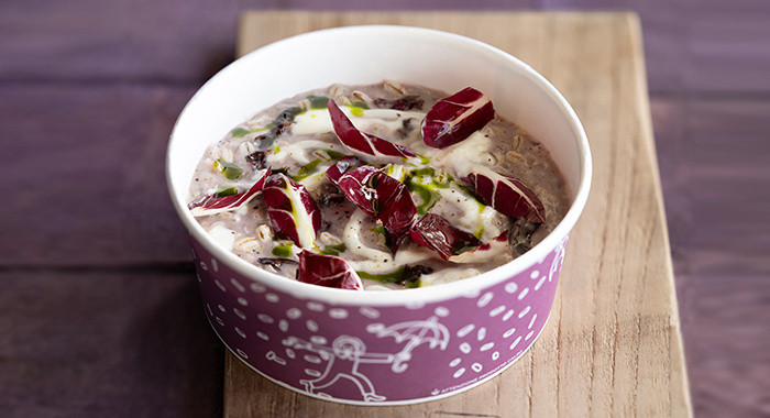 Orzotto + crema di radicchio, taleggio, olio all'erba cipollina