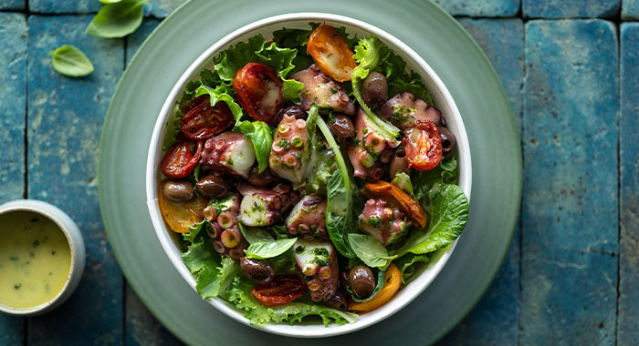 Polpo, pomodorini confit, olive taggiasche + misticanza