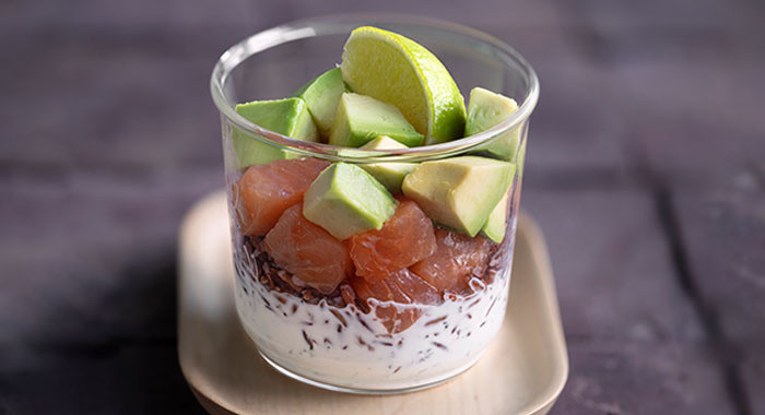 Salmone, avocado, tzatziki + riso rosso