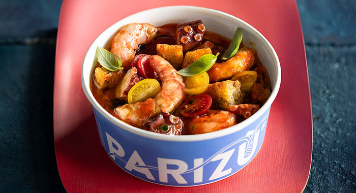 Zuppa di pesce, pomodorini rossi e gialli, crostini