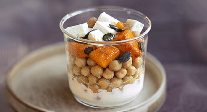 Zucca, feta, semi di zucca + ceci