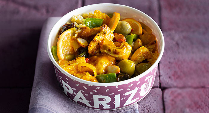 Pollo speziato + riso, peperoni, olive, arance, mandorle