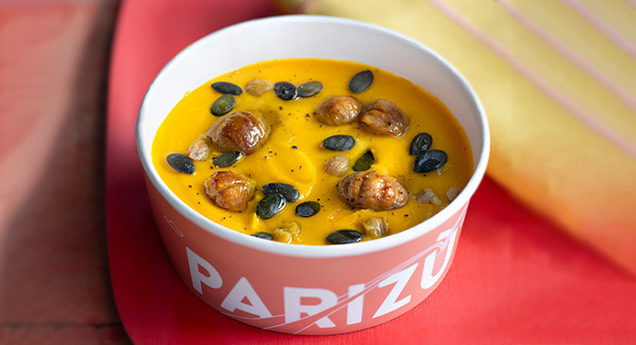 Crema di zucca, semi di zucca, castagne e olio al rosmarino
